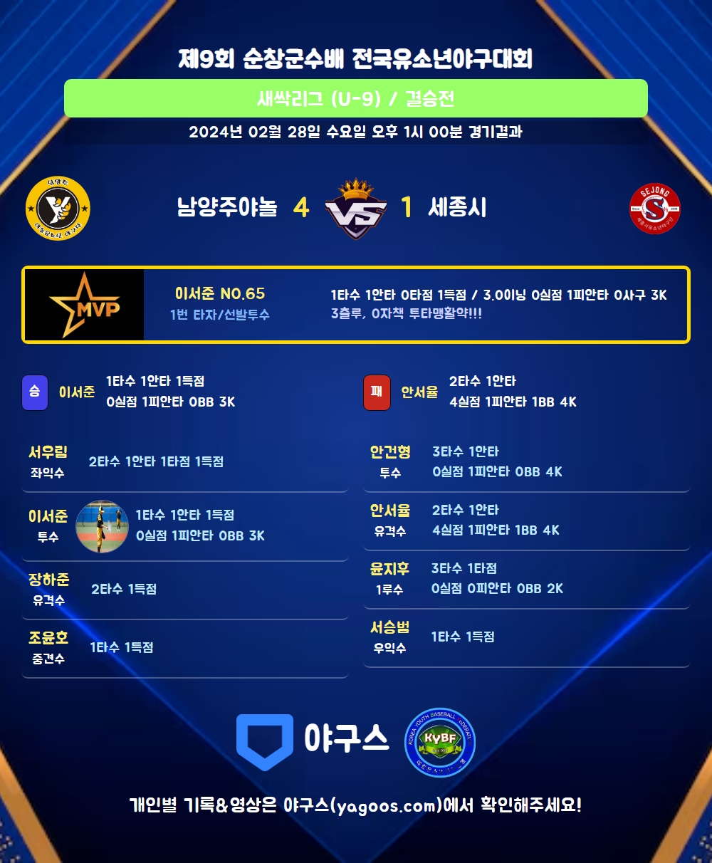 | 1 | 투 | 이서준(65) | 우전안 | - | 4구 | - | 4구 | 1 | 1 | 0 | 1 | 0 | 0 | 2 | 0 | 1.000 |