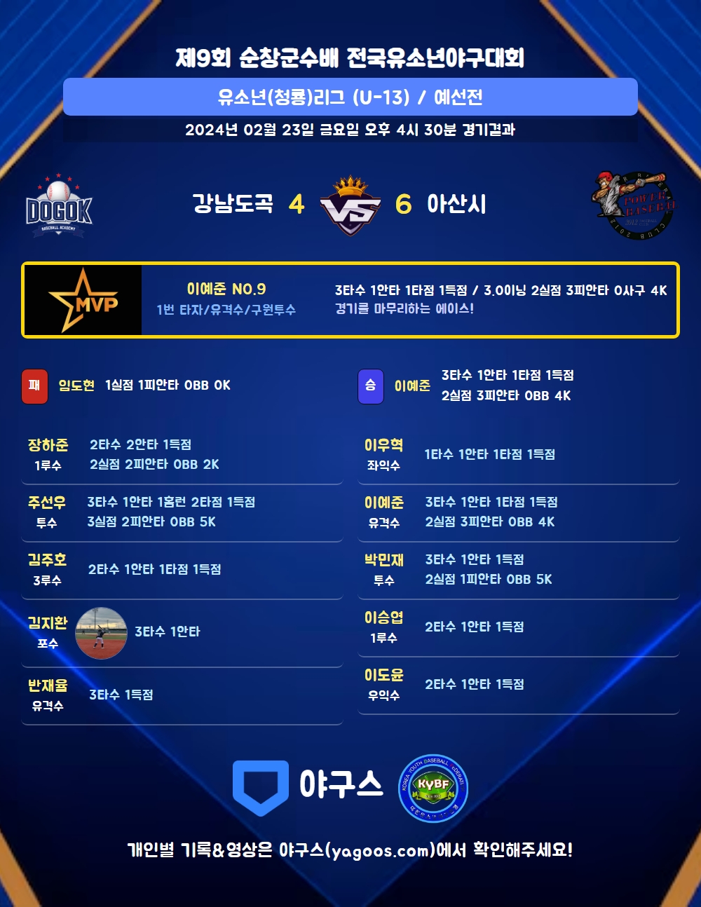 | 2 | 이예준(9) | 승 | - | 14 | 3 | 3 | 0 | 2 | 4 | 45 | 2 | 1 | 0 |