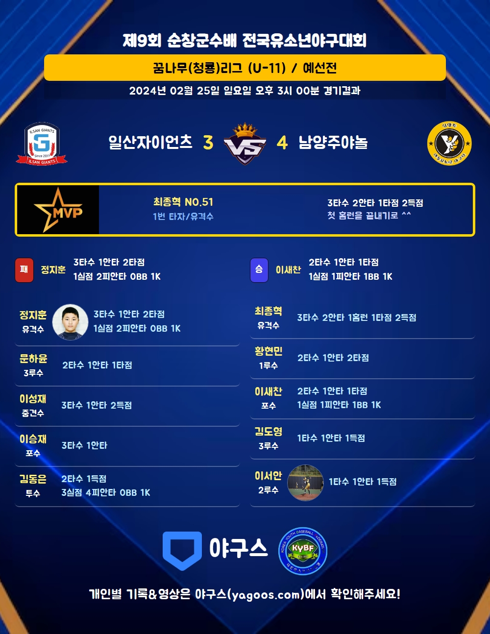| 일산자이언츠 | 1 | 0 | 1 | 0 | 1 | 3 | 4 | 2 | 3 | |