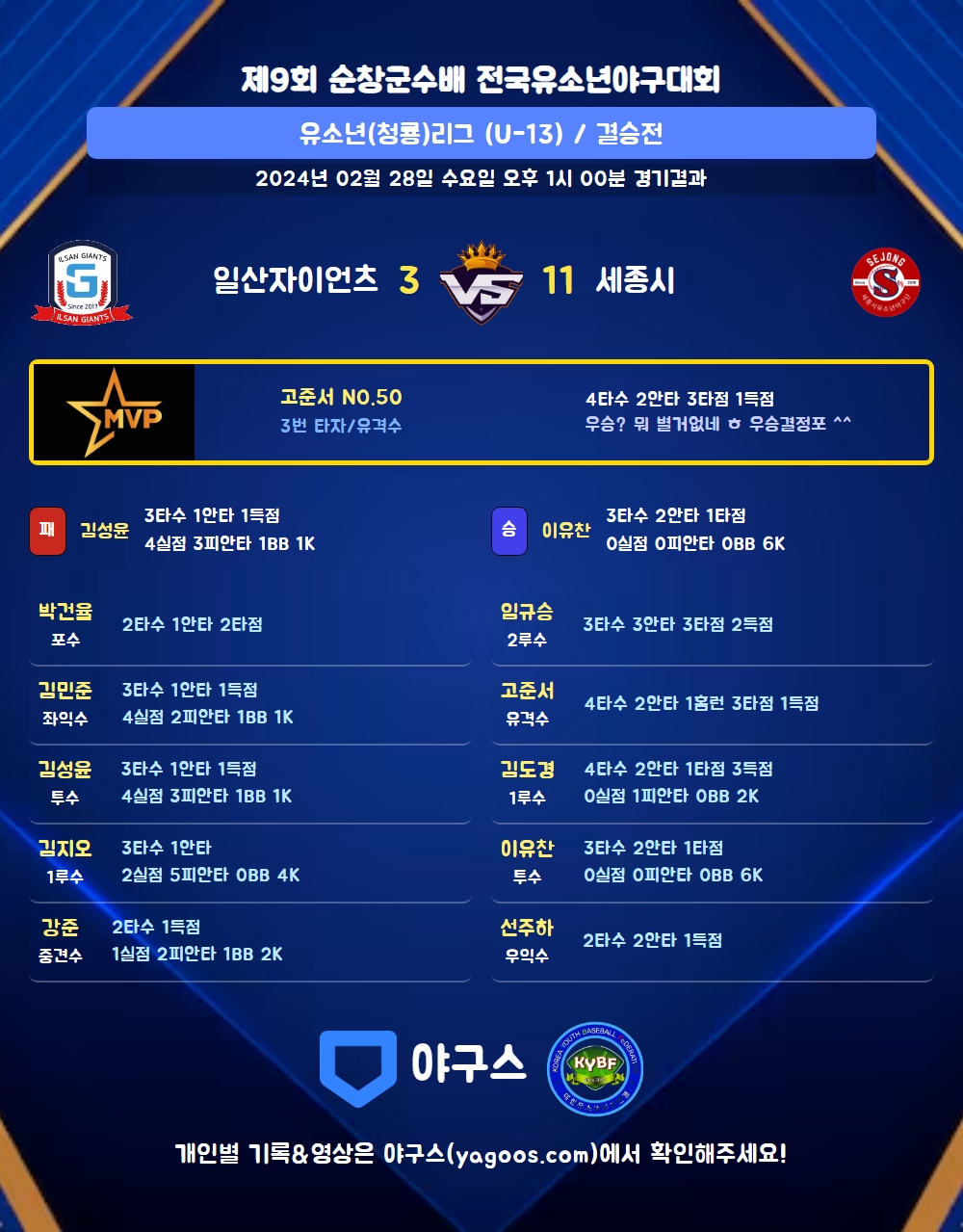 | 일산자이언츠 | 0 | 0 | 0 | 0 | 1 | 2 | 3 | 4 | 2 | 4 | |