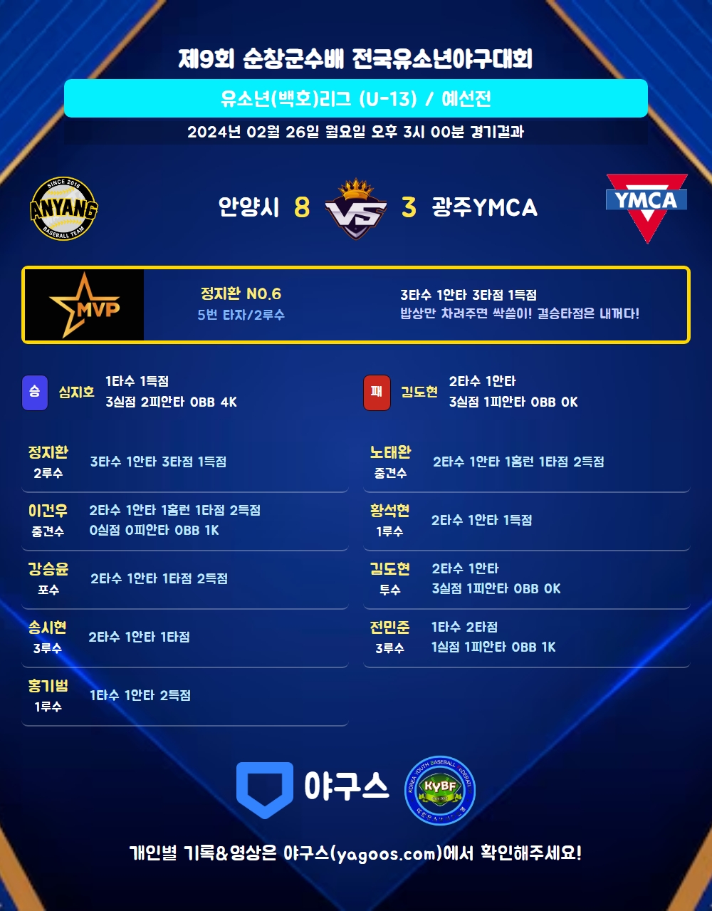 | 1 | 김도현(25) | 패 | - | 3 | 2 | 1 | 1 | 1 | 0 | 13 | 3 | 3 | 0 |
