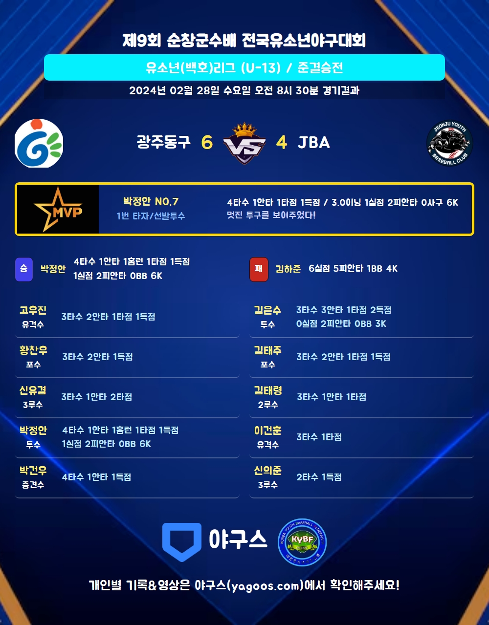 | 1 | 박정안(7) | 승 | - | 11 | 2 | 2 | 0 | - | 6 | 44 | 1 | 1 | 0 |