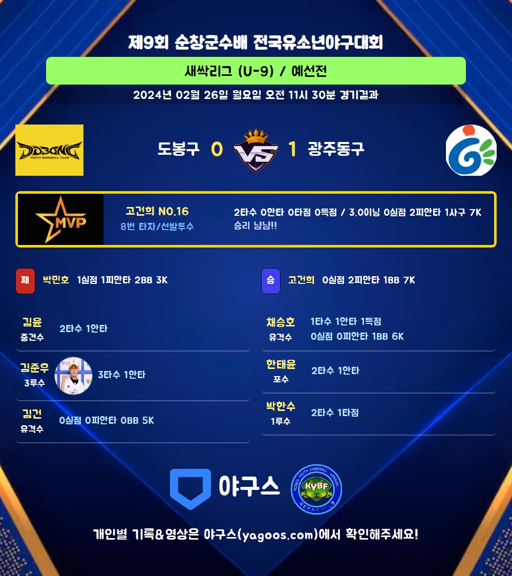 | 1 | 고건희(16) | 승 | - | 13 | 2 | 2 | 0 | 2 | 7 | 43 | 0 | 0 | 0 |