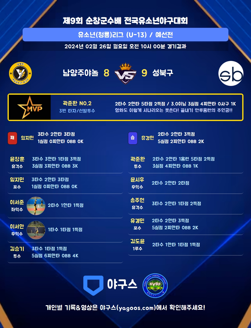 | 3 | 투 | 곽준환(2) | 투파플 | - | 좌전2 | 좌중홈 | 2 | 2 | 5 | 2 | 1 | 0 | - | 0 | 1.000 |