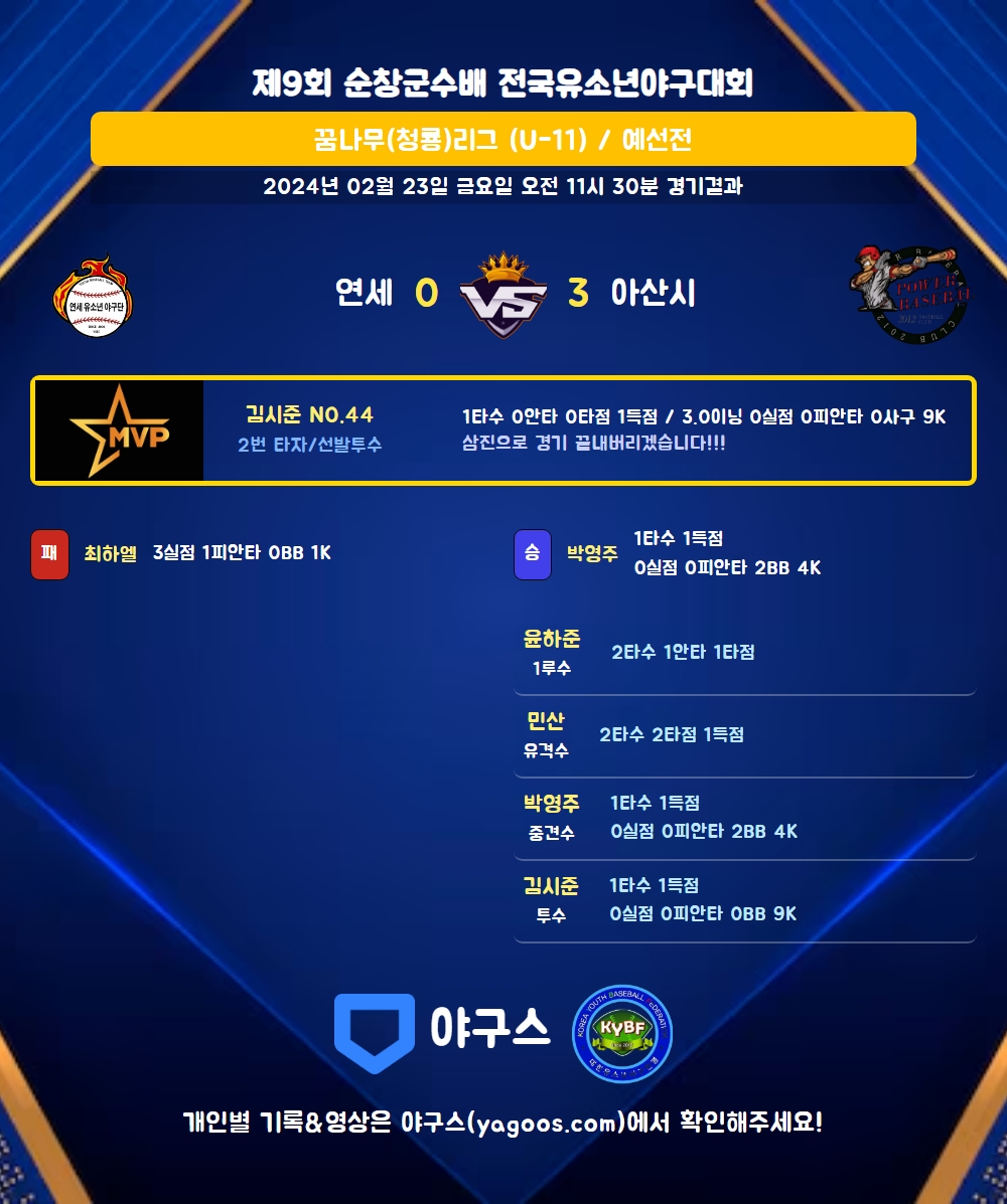 | 1 | 김시준(44) | - | - | 10 | 0 | 0 | 0 | 1 | 9 | 50 | 0 | 0 | 0 |