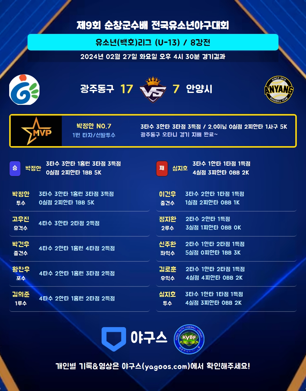 | 홈런 | 박정안(7) 박건우(52) 황찬우(23) 김의준(40) |