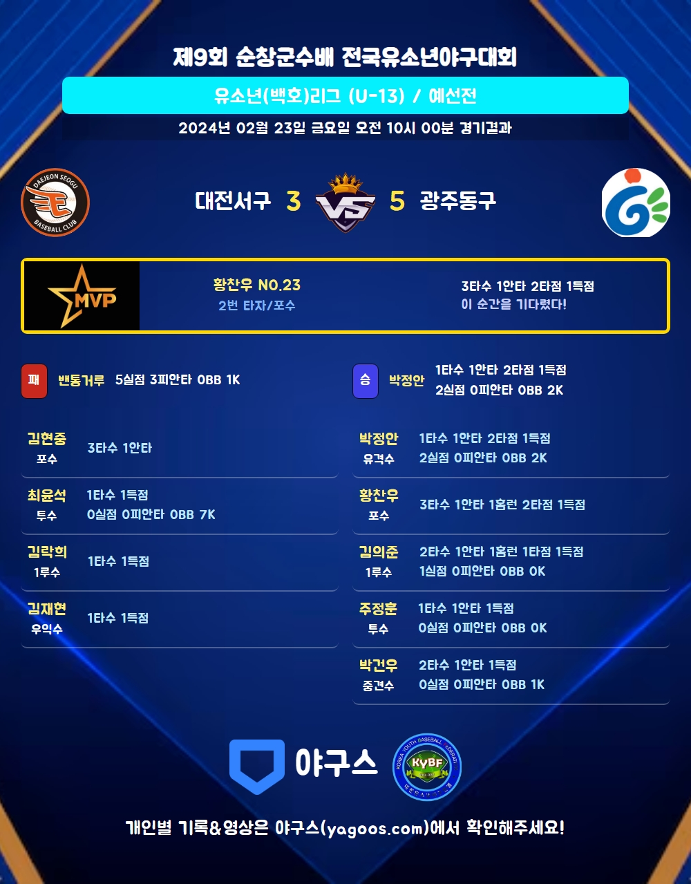 | 2 | 포 | 황찬우(23) | 유땅(출) | - | 삼진 | - | 우중홈 | 3 | 1 | 2 | 1 | 1 | 0 | - | 1 | 0.333 |