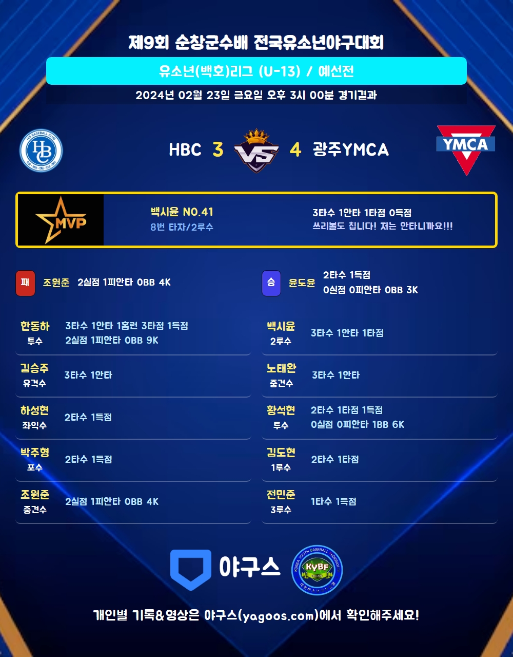 | 광주YMCA | 2 | 0 | 0 | 0 | 2 | 4 | 2 | 2 | 9 |