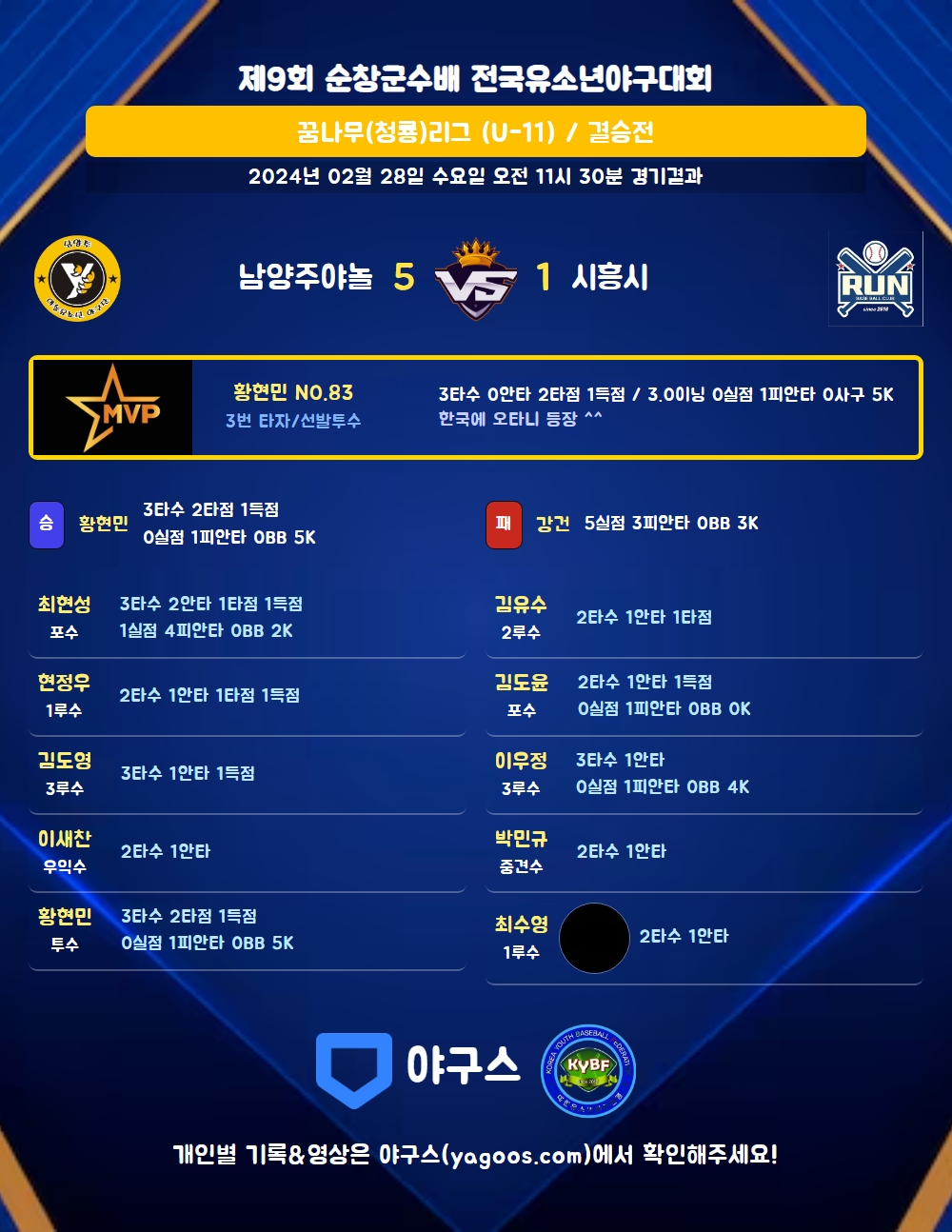 | 4 | 포 | 김도윤(13) | - | 유땅 | - | 우중안 | - | 2 | 1 | 0 | 1 | 0 | 0 | - | 0 | 0.500 |