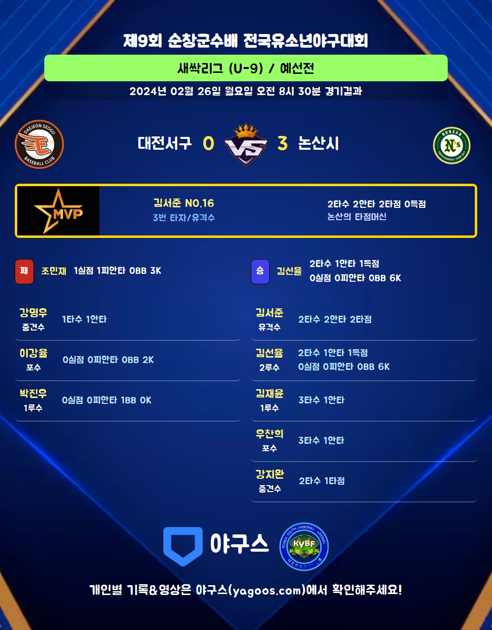 | 4 | 포 | 우찬희(98) | 삼진 | 투플 | - | 중전안 | - | 3 | 1 | 0 | 0 | 0 | 0 | - | 1 | 0.333 |