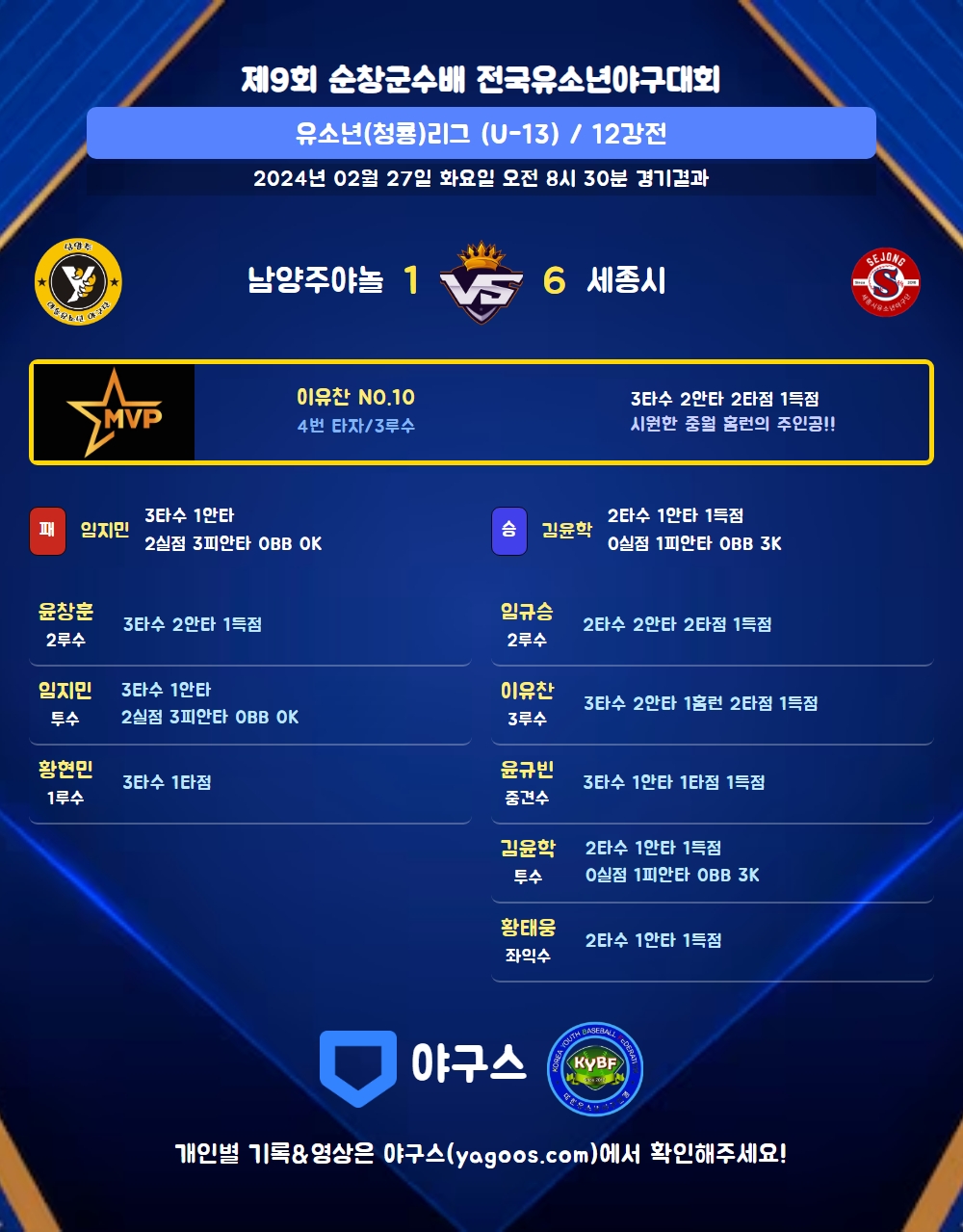 | 6 | 중 | 윤규빈(1) | - | 2플 | - | 우전안 | 3땅 | - | 3 | 1 | 1 | 1 | 0 | 1 | - | 0 | 0.333 |