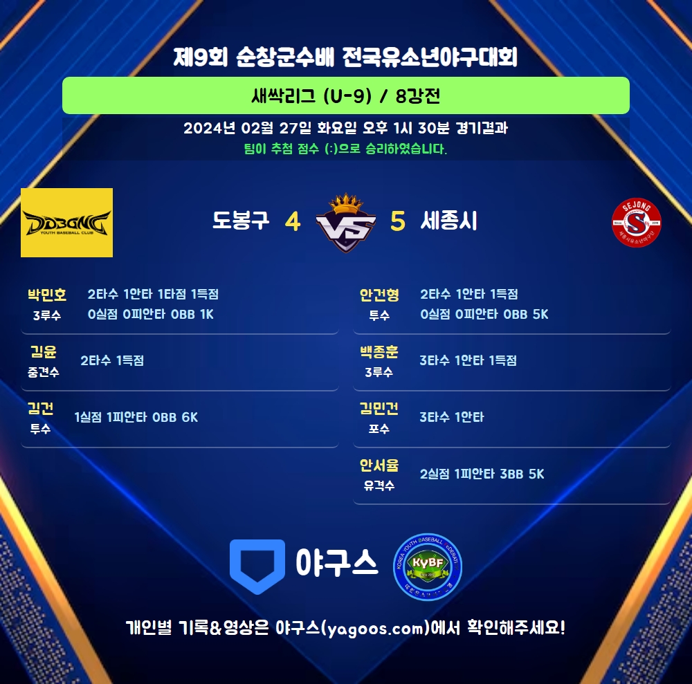 | 9 | 우 | 곽도현(33) | - | - | 4구 | 삼진 | - | 1 | 0 | 0 | 0 | 0 | 0 | 1 | 1 | 0.000 |