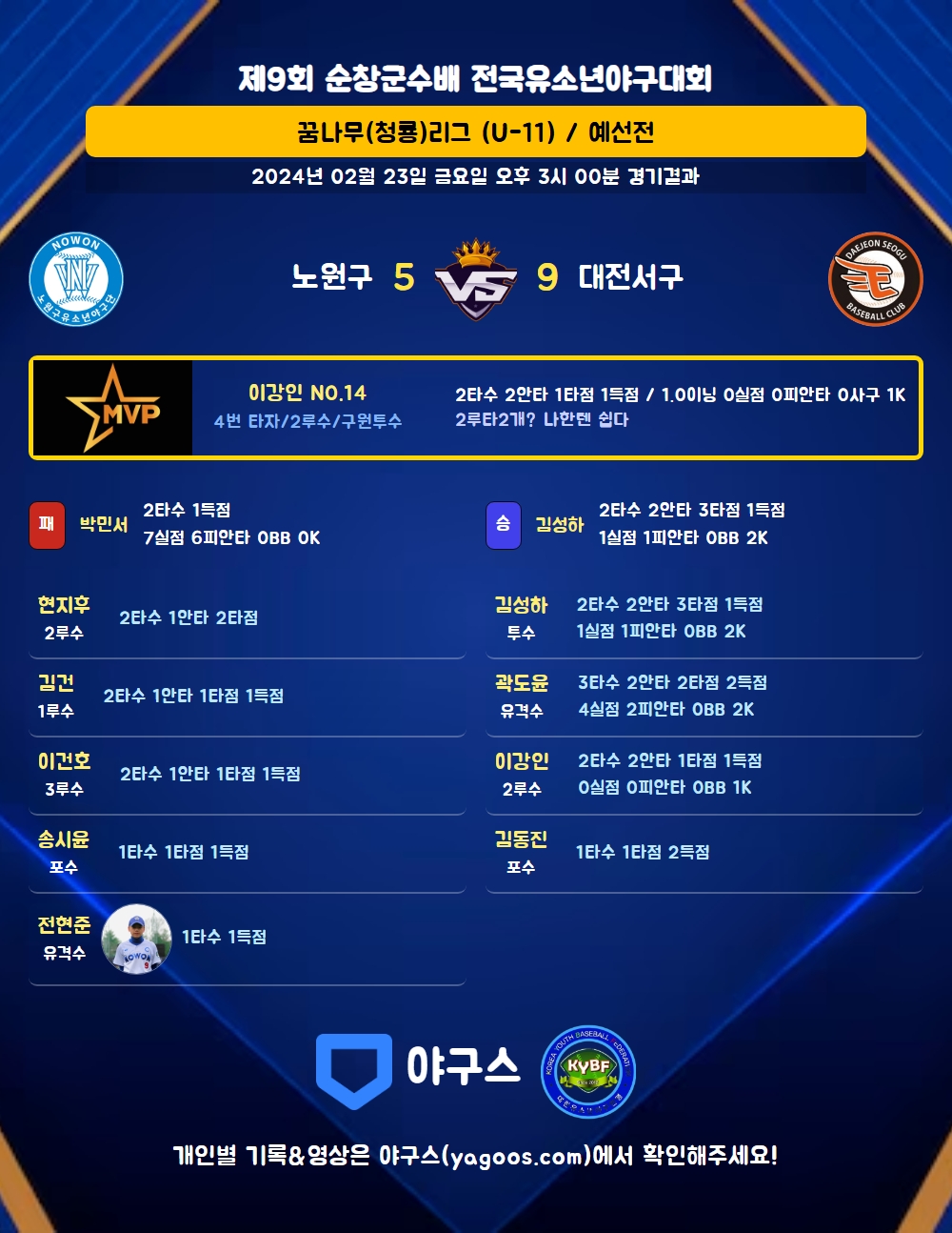 | 1 | 유 | 전현준(9) | 4구 | 2땅 | - | 4구 | 1 | 0 | 0 | 1 | 0 | 1 | 2 | 0 | 0.000 |