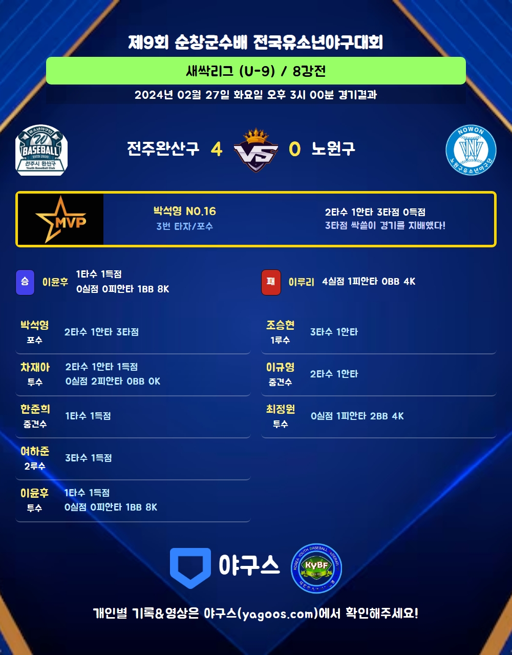 | 3 | 이윤후(2) | 승 | - | 10 | 0 | 0 | 0 | 1 | 8 | 40 | 0 | 0 | 0 |
