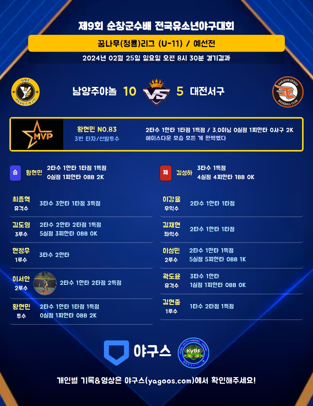 | 1 | 황현민(83) | 승 | - | 11 | 1 | 1 | 0 | 2 | 2 | 35 | 0 | 0 | 0 |