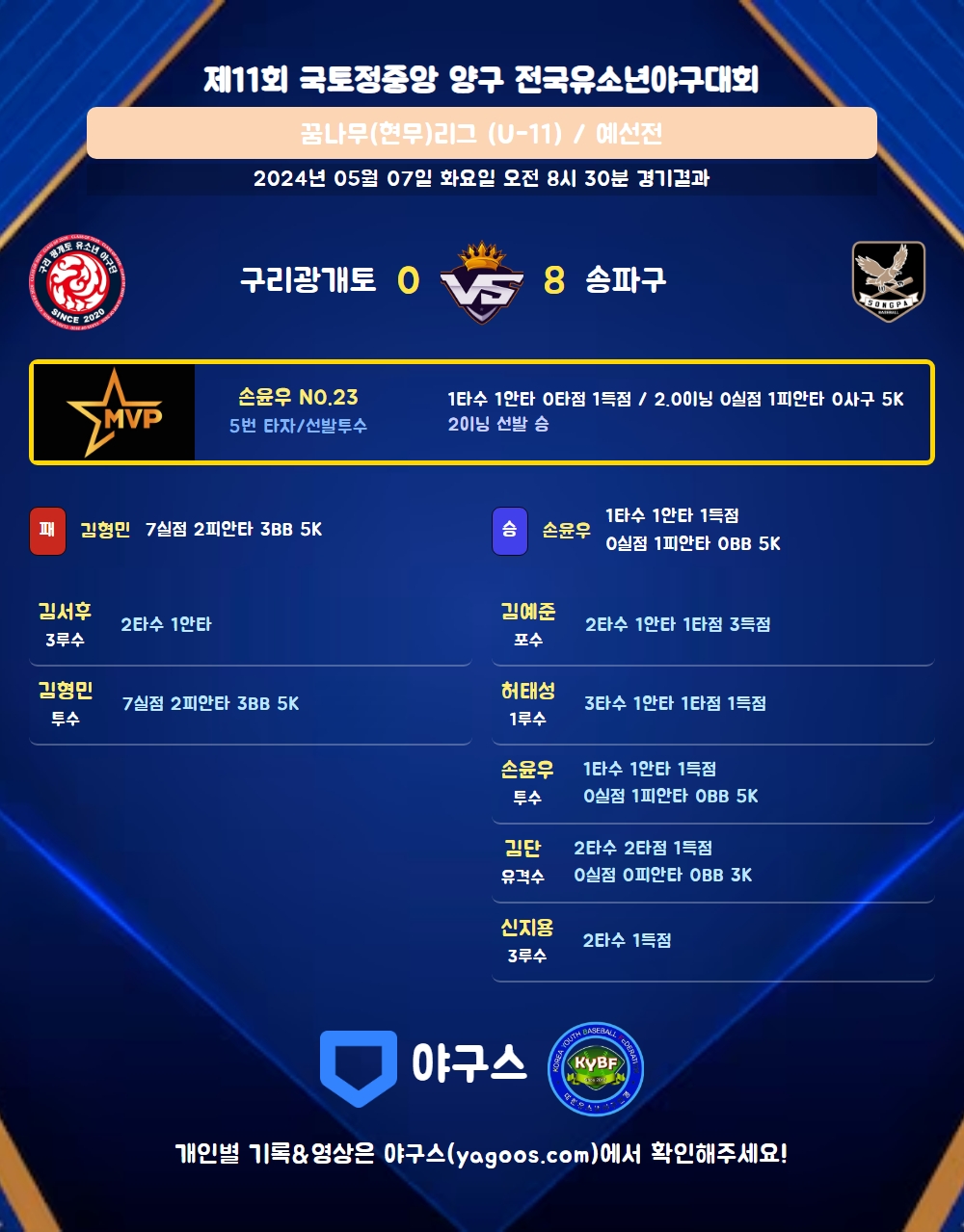 | 4 | 포 | 김예준(99) | 중전안 | 3실 | - | 4구 | 2 | 1 | 1 | 3 | 0 | 1 | 1 | 0 | 0.500 |