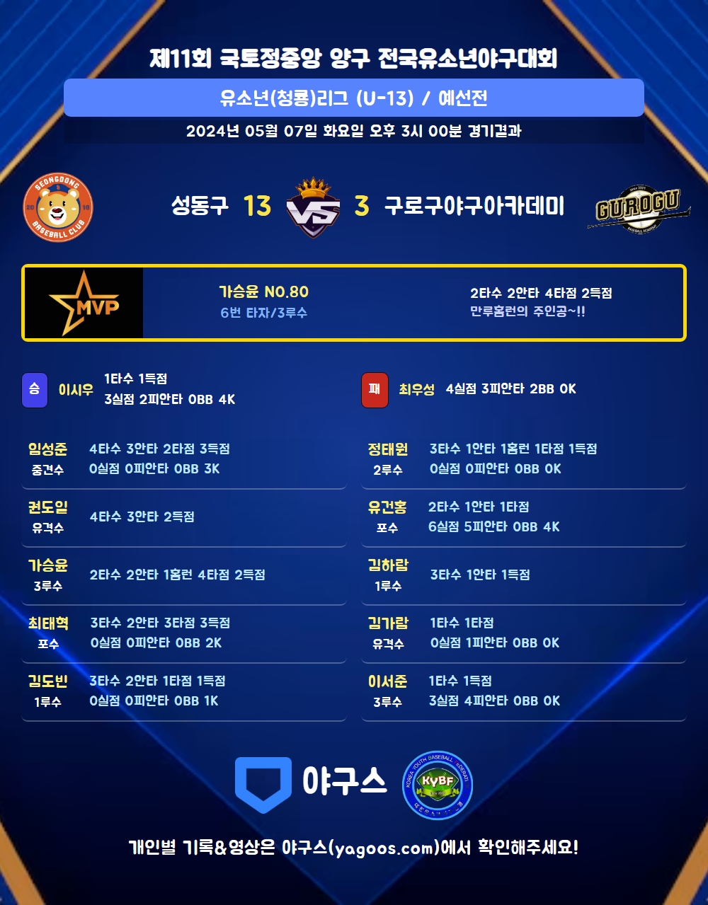 | 구로구야구아카데미 | 3 | 0 | 0 | 0 | 3 | 3 | 2 | 4 |