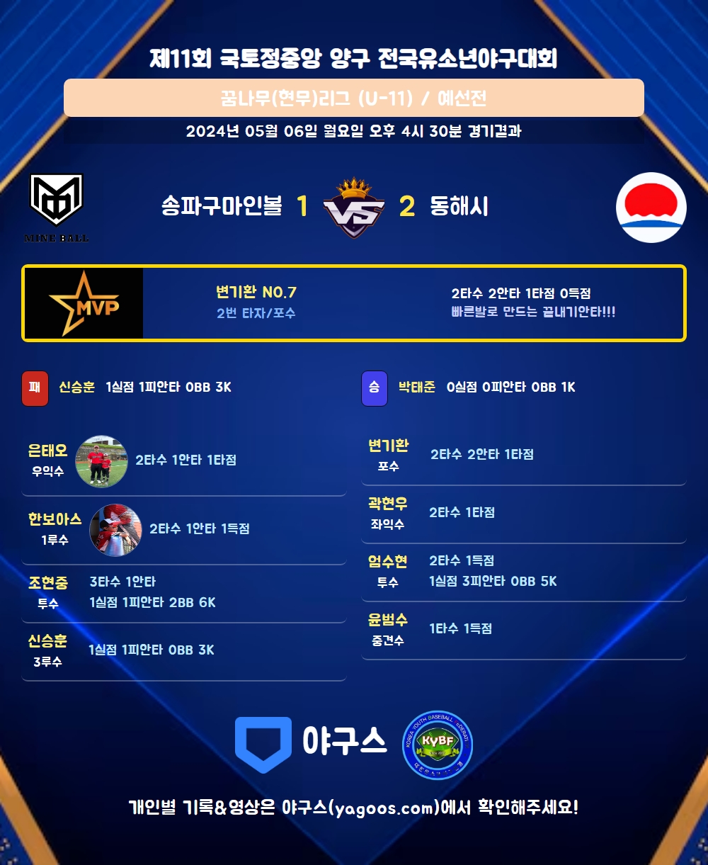 | 9 | 우 | 은태오(14) | - | 투내안 | - | - | 투땅 | 2 | 1 | 1 | 0 | 0 | 0 | - | 0 | 0.500 |
