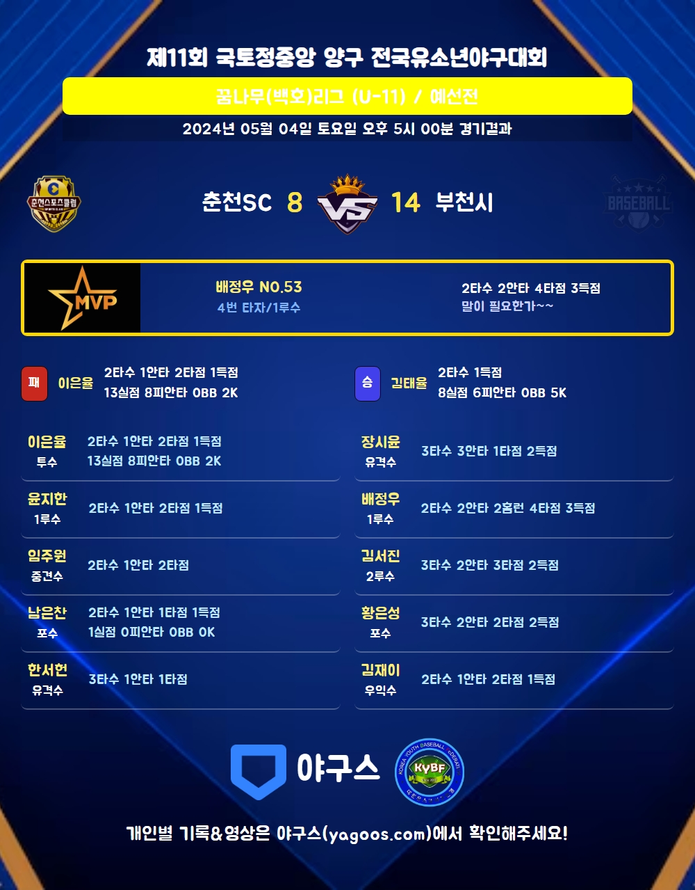 | 홈런 | 배정우(53) 노시윤(29) |
