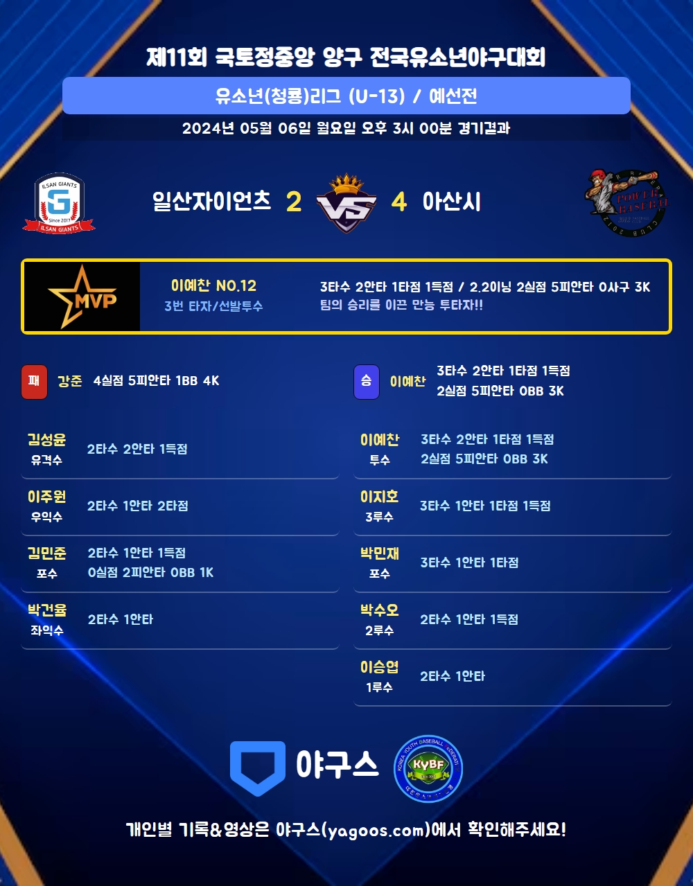 | 1 | 이예찬(12) | 승 | - | 14 | 5 | 5 | 0 | - | 3 | 35 | 2 | 2 | 450.00 |