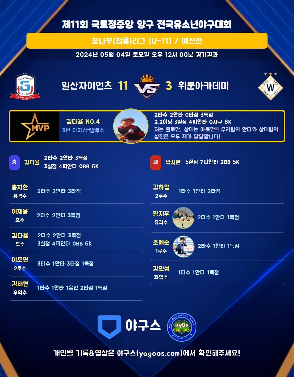 | 7 | 중 | 강민형(11) | - | 삼진 | - | - | 1 | 0 | 0 | 0 | 0 | 0 | - | 1 | 0.000 |