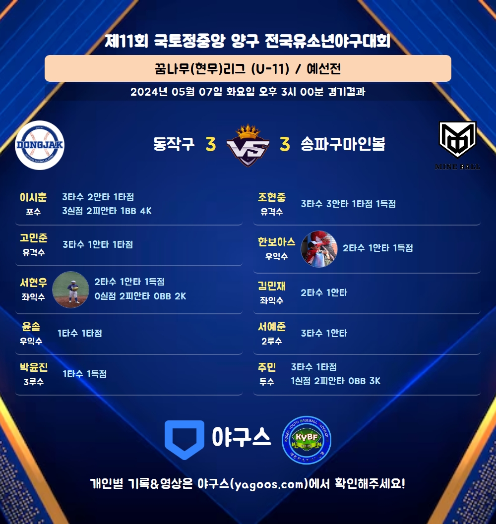 | 6 | 二 | 서예준(4) | - | 좌전안 | - | 삼진 | 투땅 | 3 | 1 | 0 | 0 | 0 | 1 | - | 1 | 0.333 |