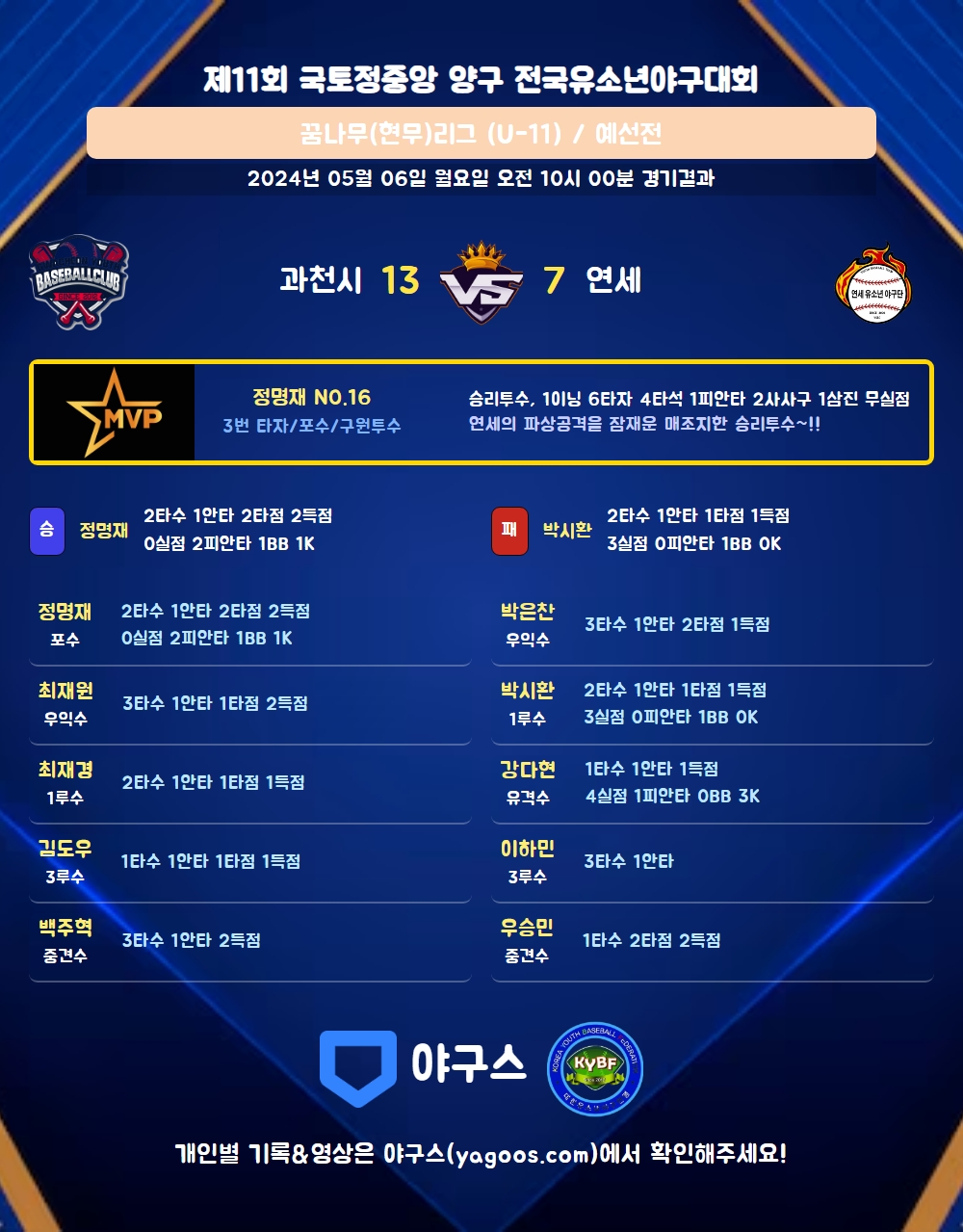 | 3 | 포 | 정명재(16) | 유실 | 투내안 | - | 사구 | - | 2 | 1 | 2 | 2 | 0 | 4 | 1 | 0 | 0.500 |