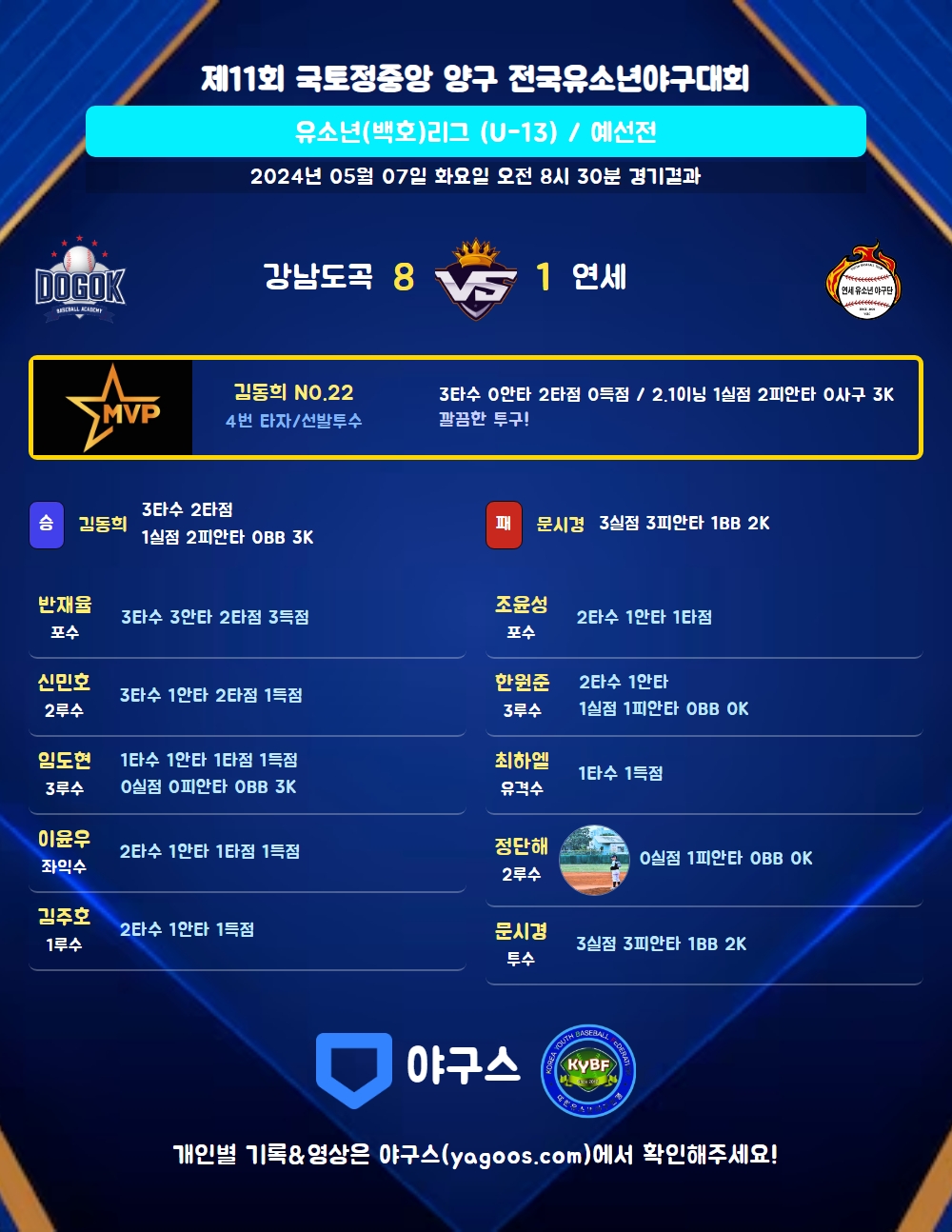 | 8 | 三 | 한원준(12) | - | 우중안 | - | 삼진 | 2 | 1 | 0 | 0 | 0 | 0 | - | 1 | 0.500 |