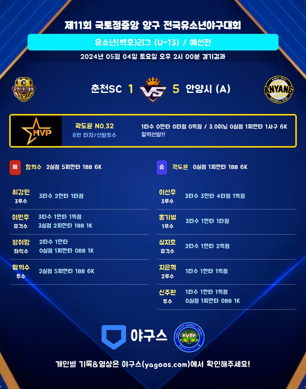 | 1 | 곽도윤(32) | 승 | - | 11 | 1 | 1 | 0 | 2 | 6 | 46 | 0 | 0 | 0.00 |