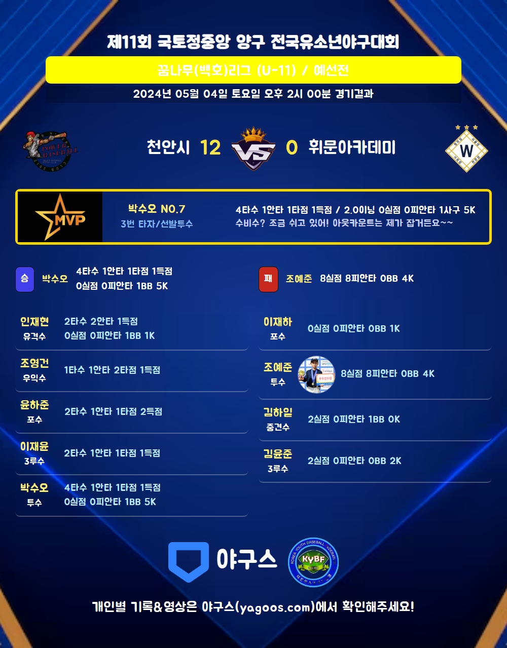 | 1 | 박수오(7) | 승 | - | 7 | 0 | 0 | 0 | 1 | 5 | 31 | 0 | 0 | 0.00 |