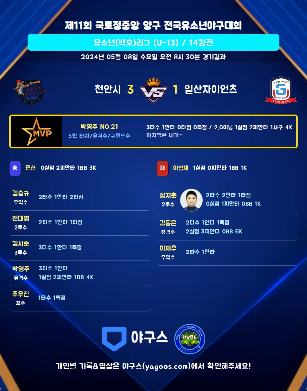 | 일산자이언츠 | 0 | 0 | 0 | 1 | 0 | 1 | 4 | 0 | 2 |