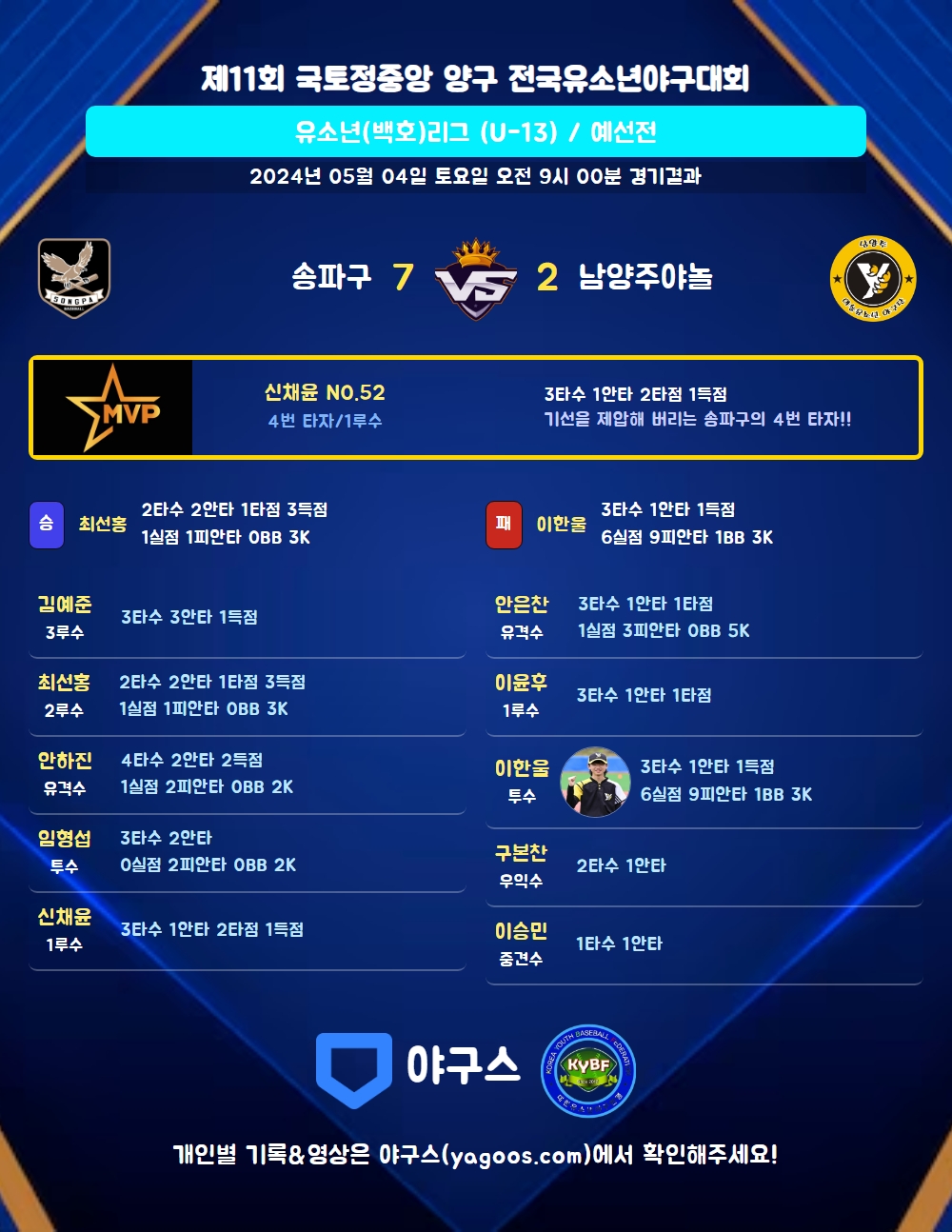 | 4 | 一 | 이윤후(87) | - | 2땅 | 좌전안 | - | 유직 | 3 | 1 | 1 | 0 | 0 | 0 | - | 0 | 0.333 |