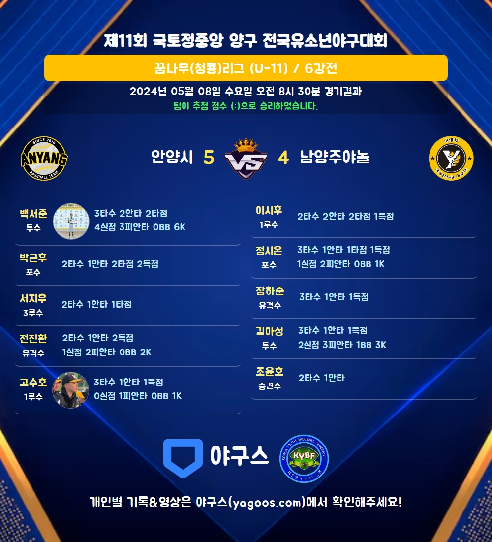 | 1 | 一 | 고수호(47) | 삼진 | - | 2땅 | - | 좌중2 | 3 | 1 | 0 | 1 | 0 | 0 | - | 1 | 0.333 |