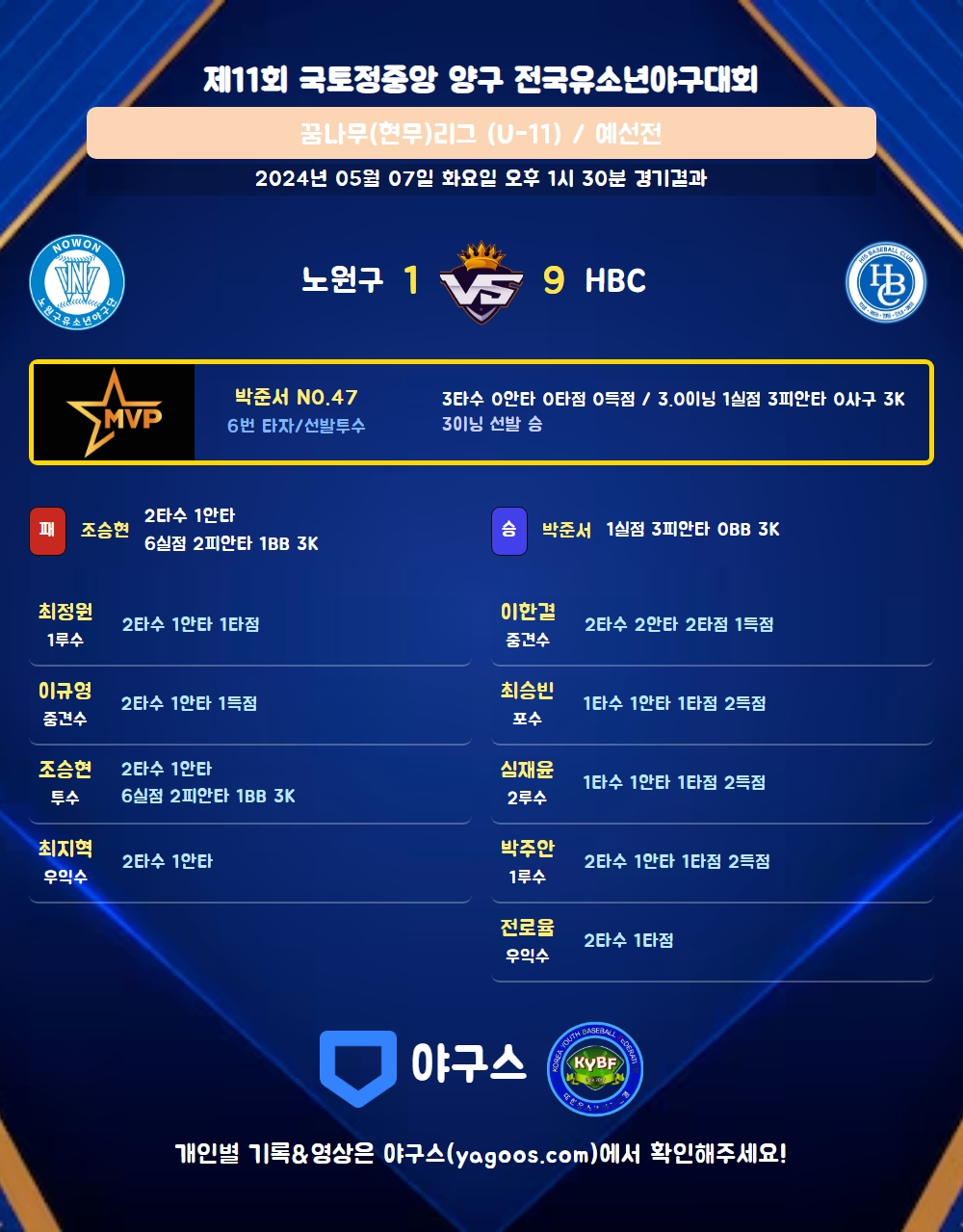 | 1 | 박준서(47) | 승 | - | 12 | 3 | 3 | 0 | - | 3 | 35 | 1 | 1 | 166.00 |