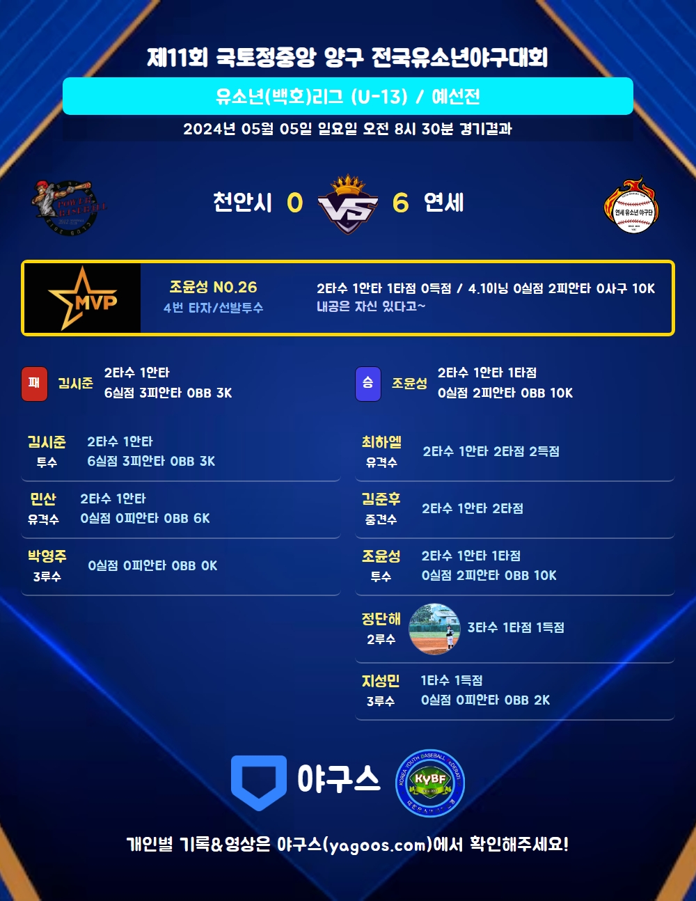 | 연세 | 1 | 5 | 0 | 0 | 0 | 6 | 3 | 0 | 4 |