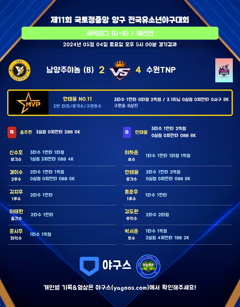 | 3 | 유 | 안태웅(11) | 2야선 | - | 좌전안 | 투플 | - | 3 | 1 | 0 | 2 | 0 | 0 | - | 0 | 0.333 |