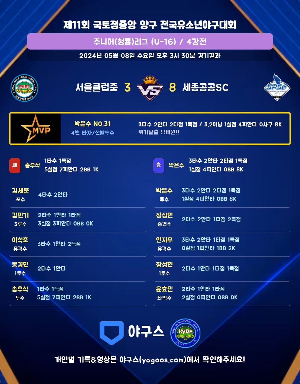 | 4 | 투 | 박은수(31) | 2내안 | 삼진 | - | 중전안 | - | - | 3 | 2 | 2 | 1 | 0 | 1 | - | 1 | 0.667 |