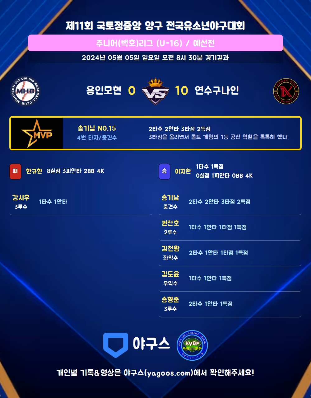 | 1 | 좌 | 김천왕(10) | 삼진 | 유내안 | - | 2 | 1 | 1 | 1 | 0 | 1 | - | 1 | 0.500 |