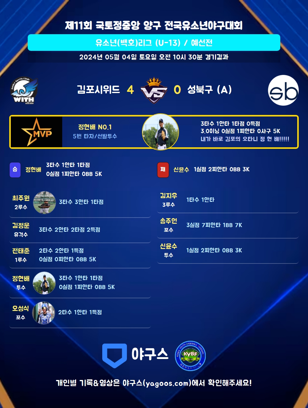 | 8 | 三 | 김지우(52) | - | - | 좌전안 | - | - | 1 | 1 | 0 | 0 | 0 | 0 | - | 0 | 1.000 |