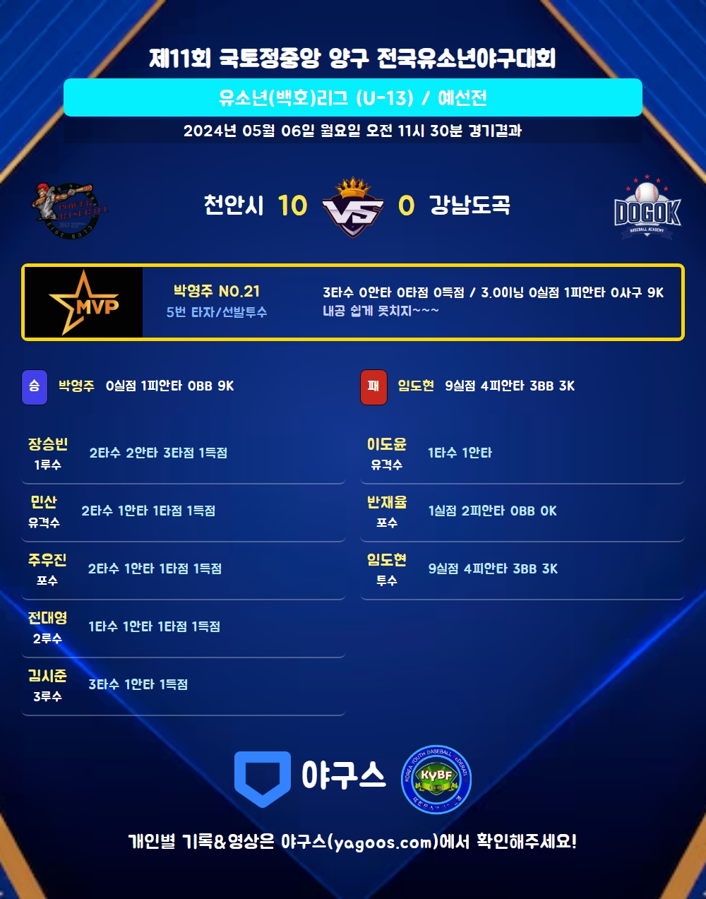 | 1 | 박영주(21) | 승 | - | 11 | 1 | 1 | 0 | 1 | 9 | 51 | 0 | 0 | 0.00 |
