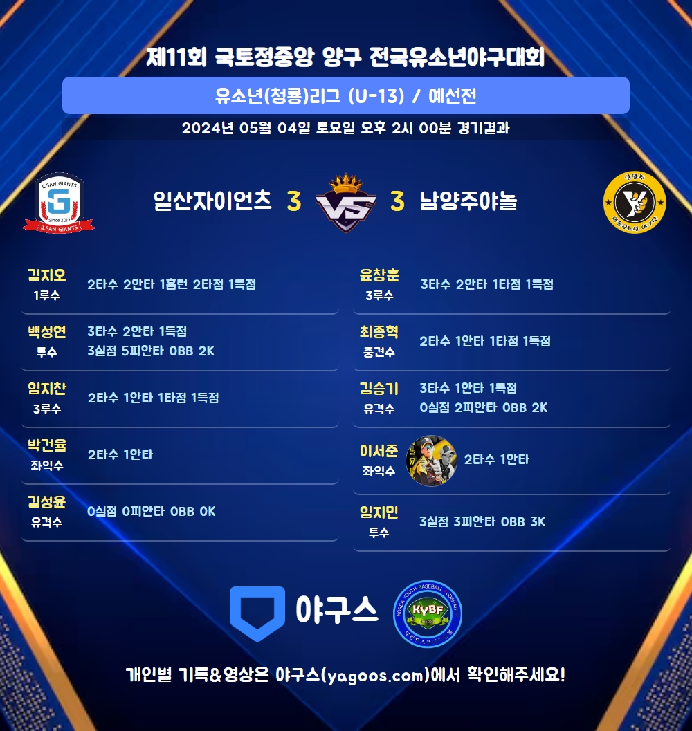 | 일산자이언츠 | 1 | 0 | 2 | 0 | 0 | 3 | 6 | 0 | 2 | |