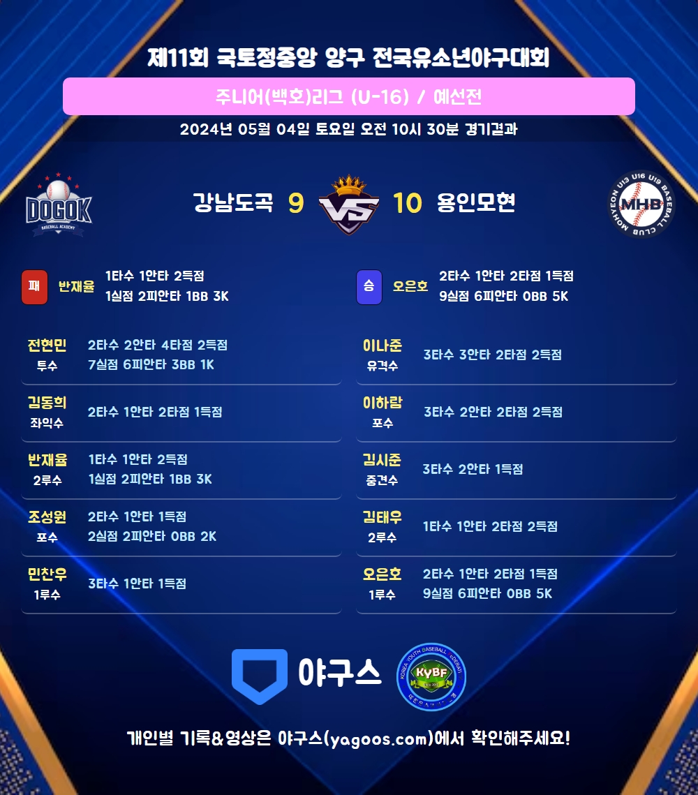 | 용인모현BC | 0 | 7 | 3 | 0 | 10 | 10 | 3 | 7 |