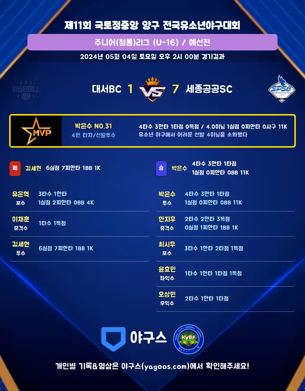 | 1 | 박은수(31) | 승 | - | 14 | 0 | 0 | 0 | 2 | 11 | 70 | 1 | 1 | 175.00 |