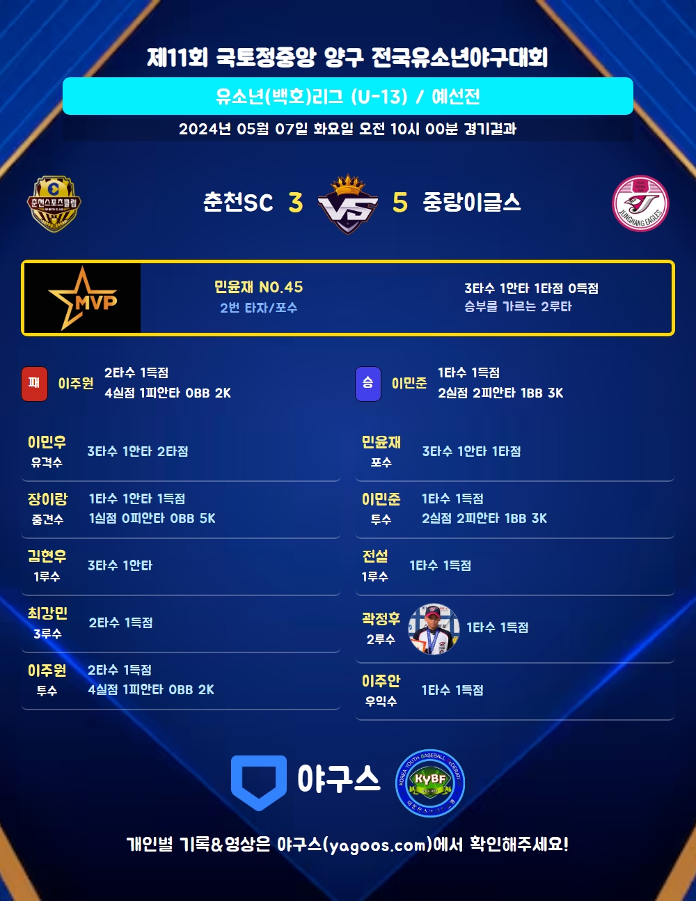 | 2 | 포 | 민윤재(45) | 좌중2 | 좌플 | - | 좌플 | - | 3 | 1 | 1 | 0 | 0 | 1 | - | 0 | 0.333 |