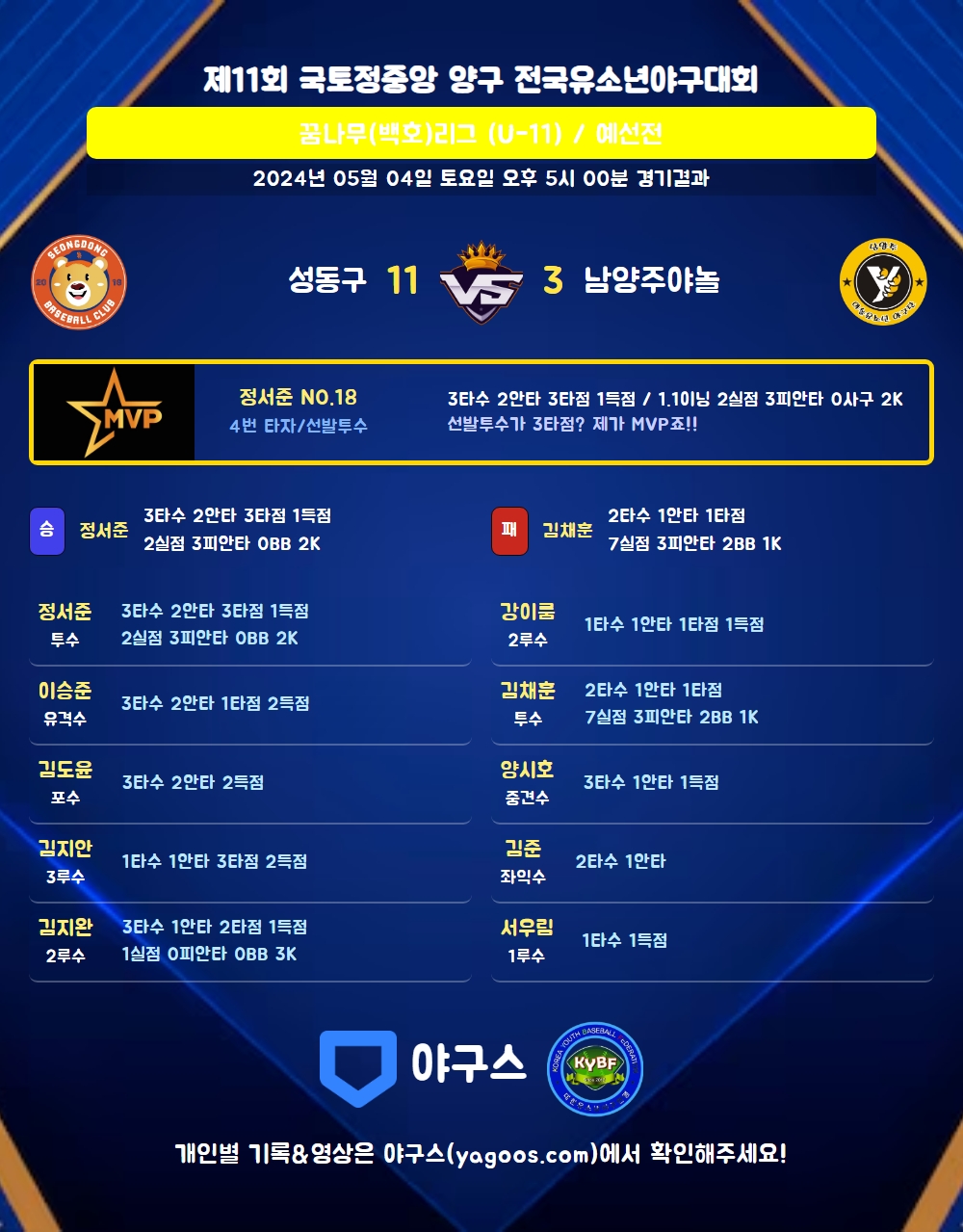 | 남양주야놀 | 1 | 1 | 0 | 1 | 3 | 4 | 3 | 4 |