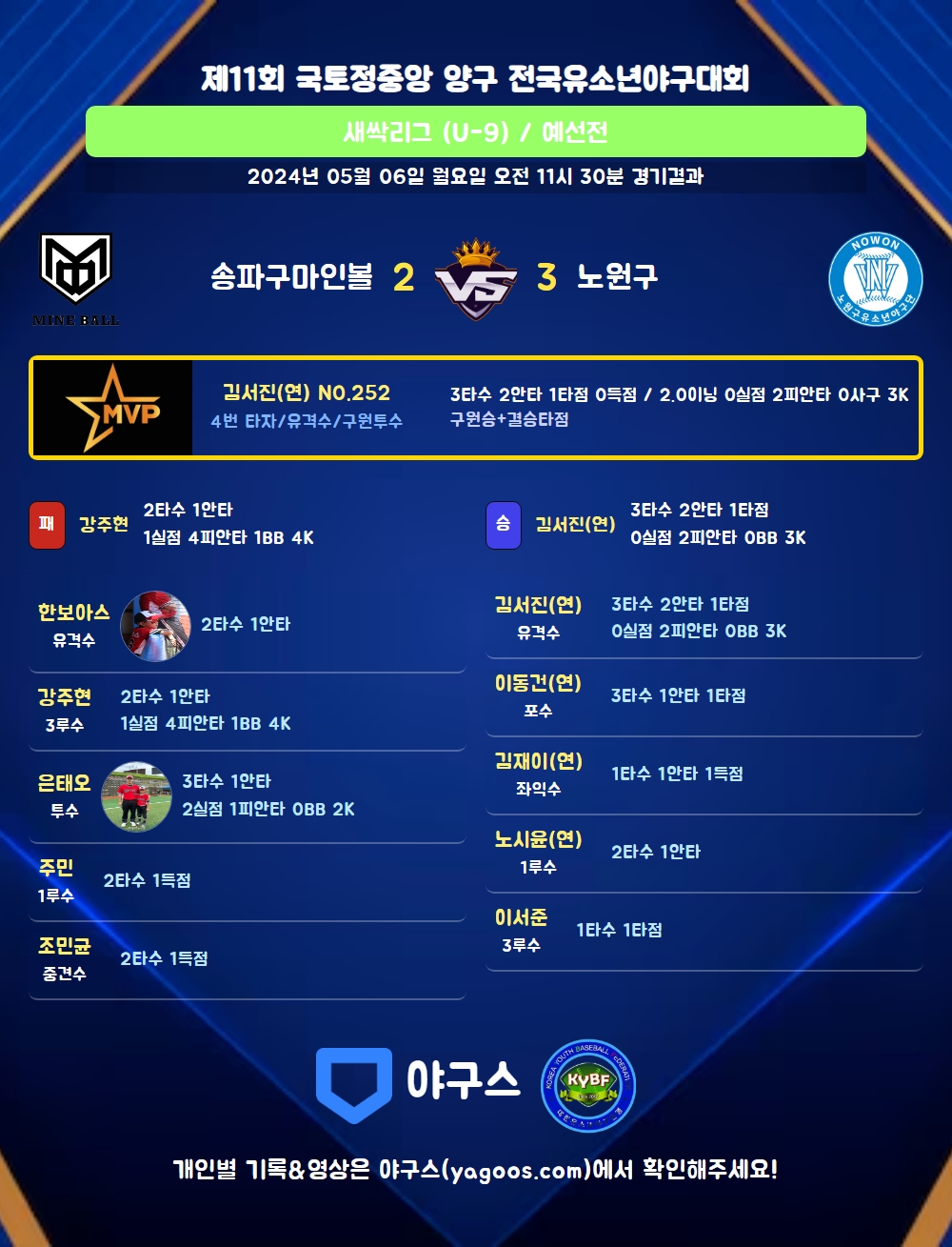| 2 | 一 | 노시윤(연)(255) | 투내안 | - | 2땅 | - | 사구 | 2 | 1 | 0 | 0 | 0 | 0 | 1 | 0 | 0.500 |