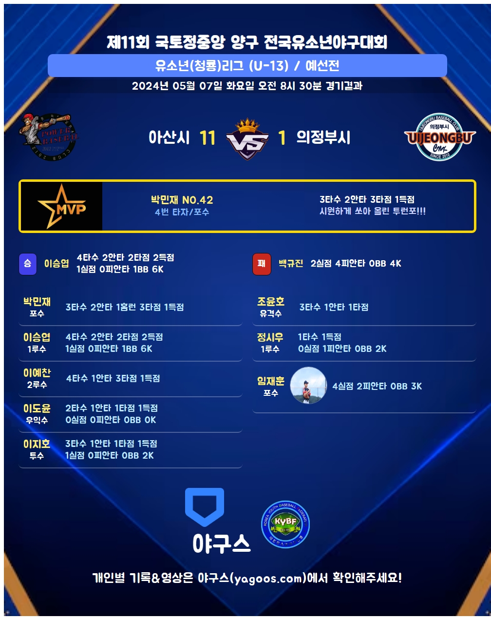 | 1 | 二 | 이예찬(12) | 삼진 | - | 유플 | - | 유야선,우전2 | 4 | 1 | 3 | 1 | 0 | 1 | - | 1 | 0.250 |