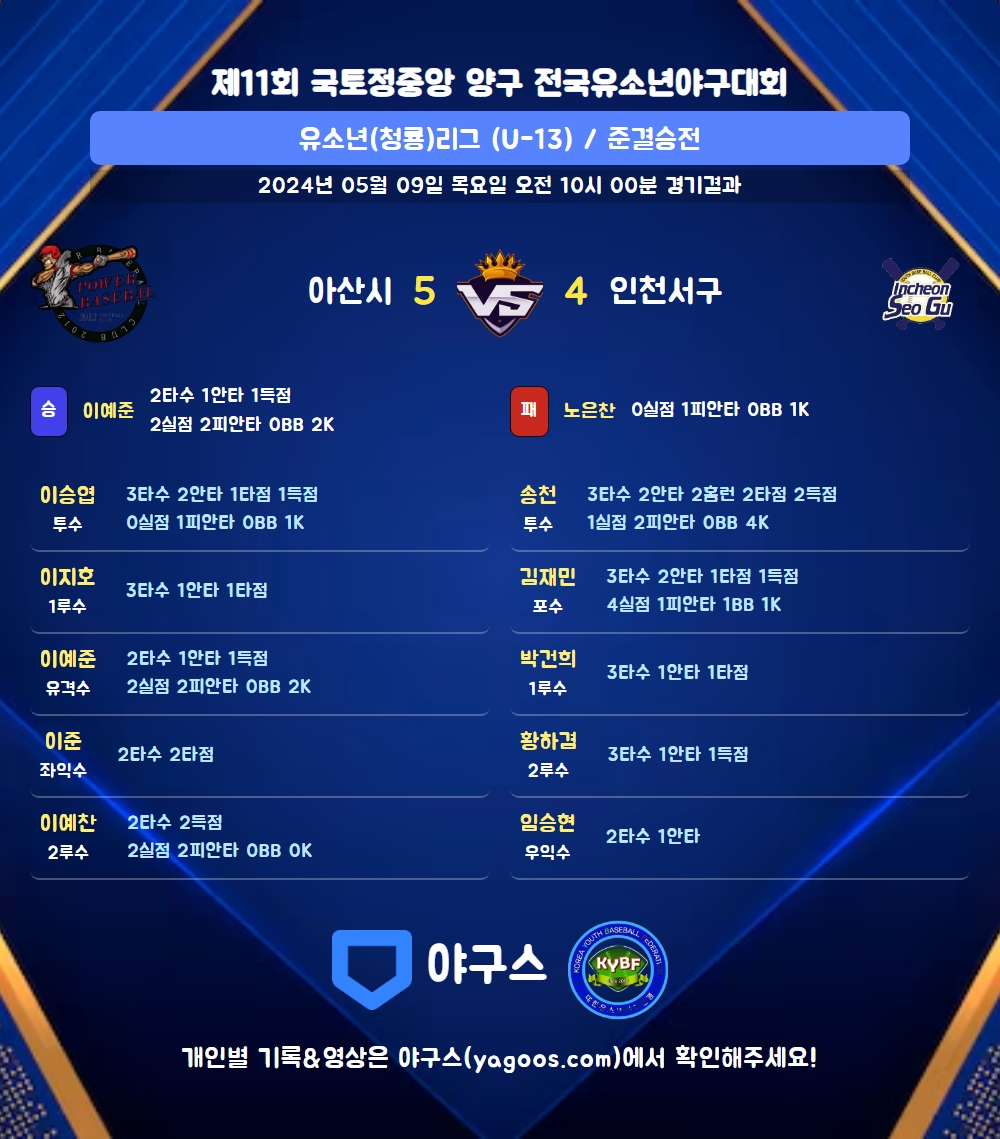 | 5 | 유 | 이예준(9) | - | 우전안 | - | 4구 | 투땅 | - | 2 | 1 | 0 | 1 | 0 | 1 | 1 | 0 | 0.500 |
