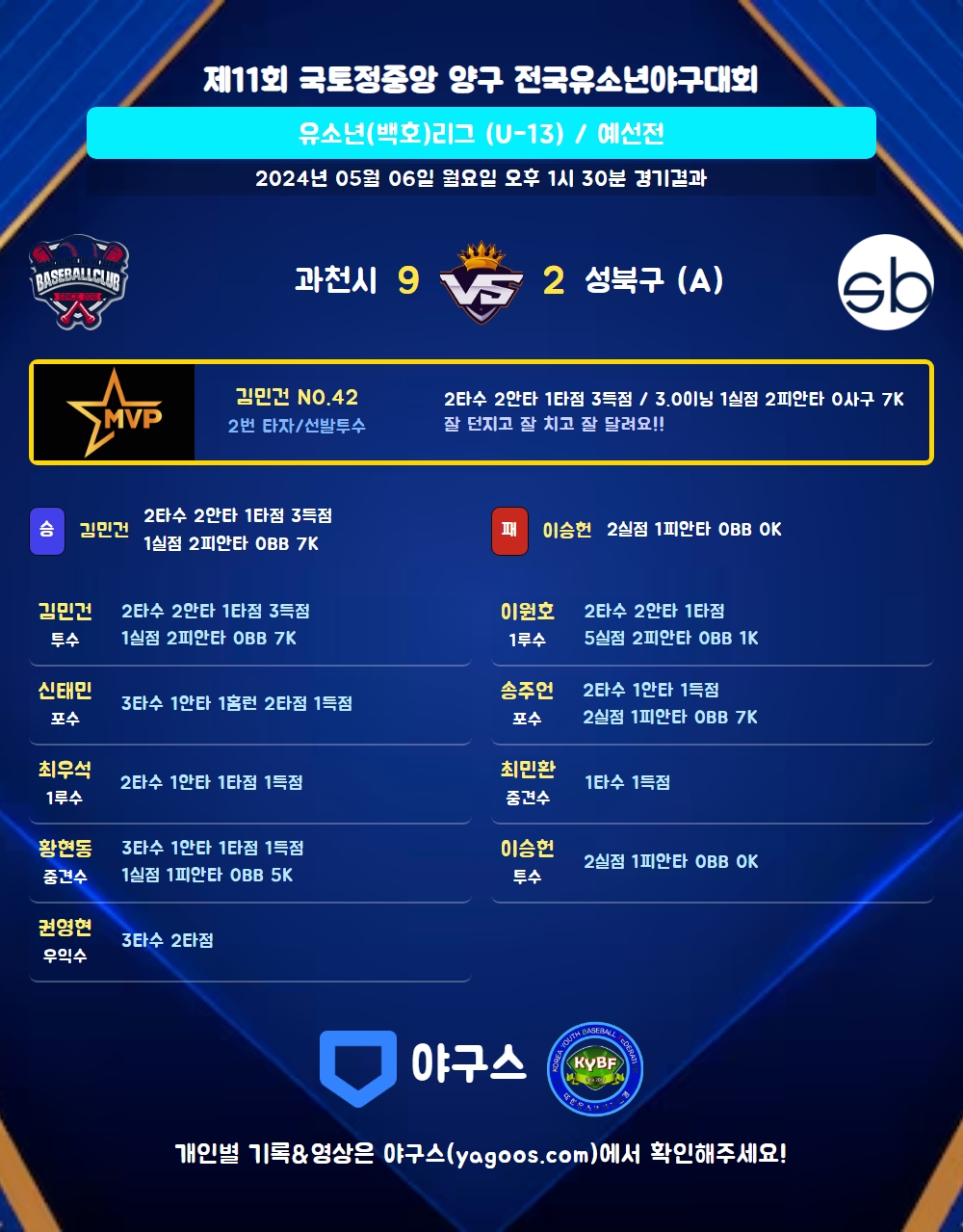 | 1 | 김민건(42) | 승 | - | 11 | 2 | 2 | 0 | - | 7 | 36 | 1 | 1 | 200.00 |