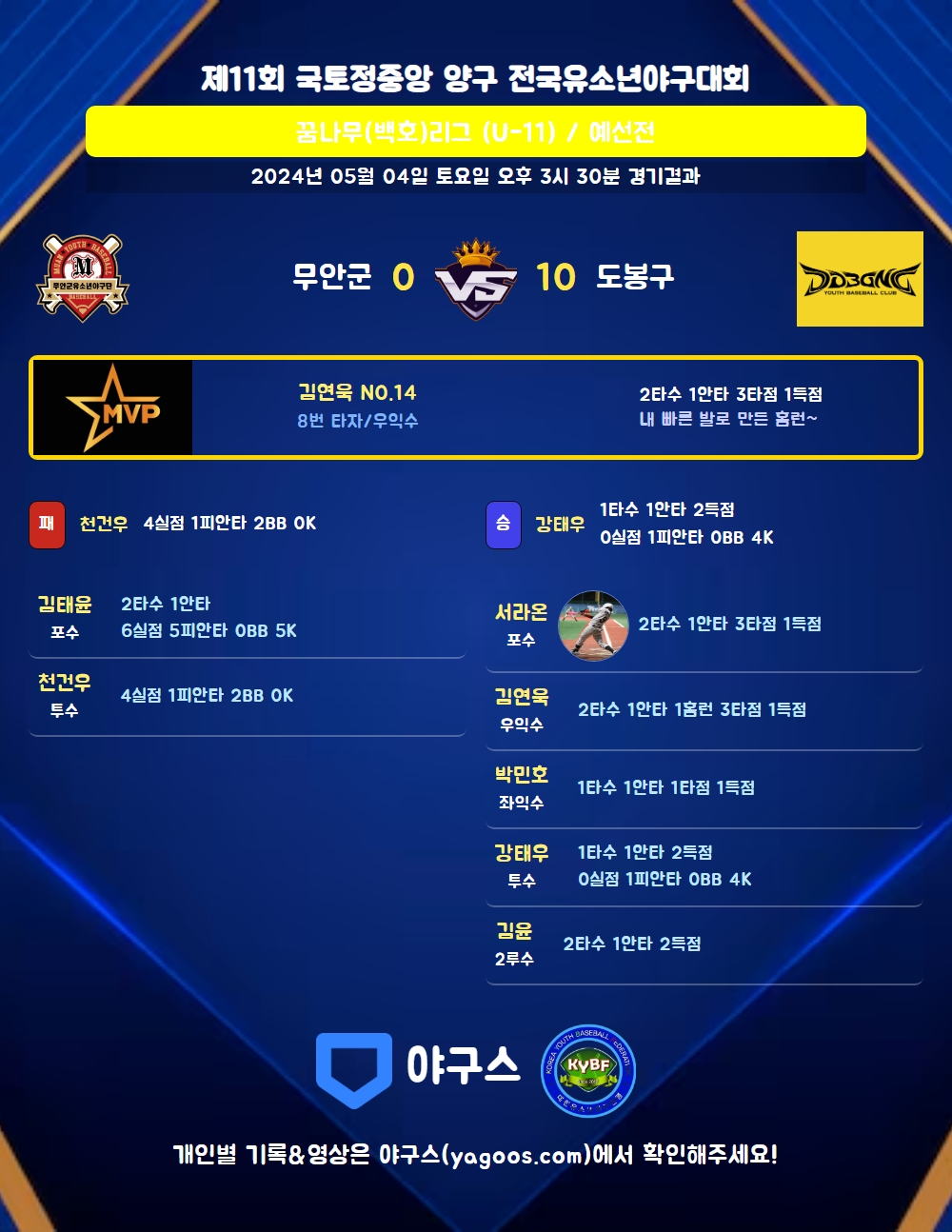 | 1 | 강태우(10) | 승 | - | 12 | 1 | 1 | 0 | 3 | 4 | 51 | 0 | 0 | 0.00 |